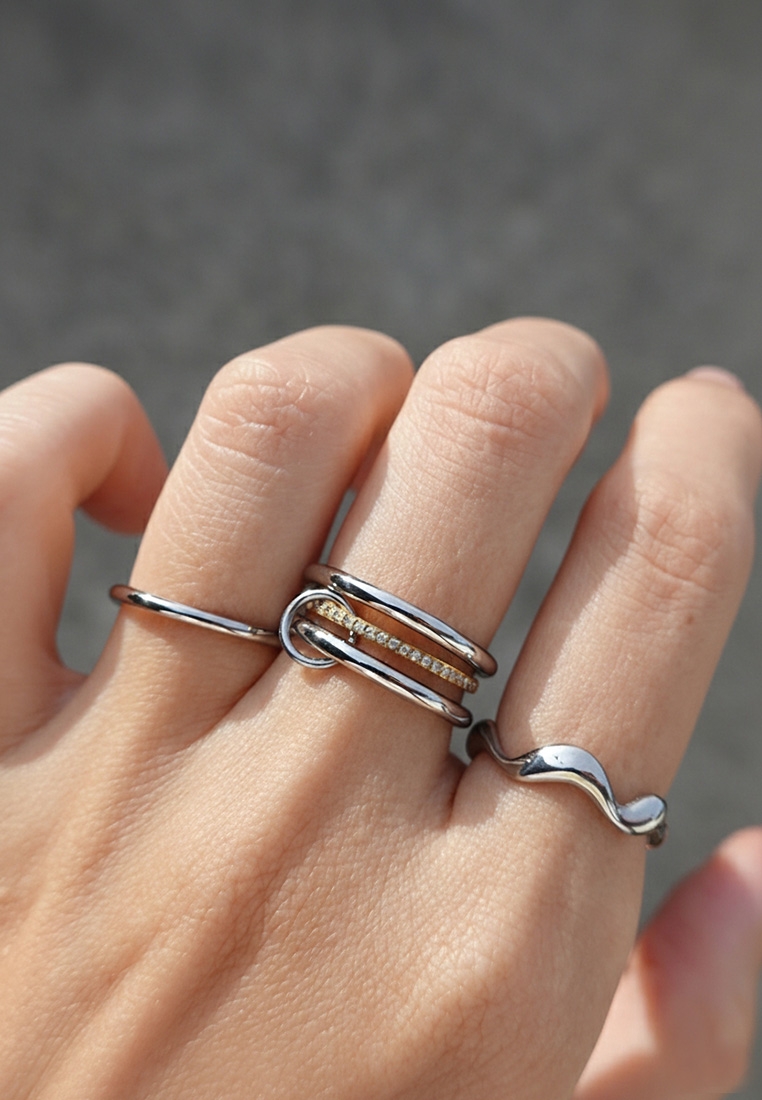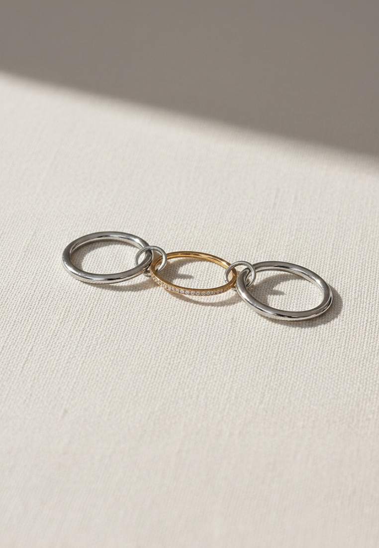 Why settle for one when you can have the perfect trio? This interlocking ring set brings together industrial sculptural design and refined sparkle. Featuring three intertwined bands—two polished silver-toned rings and one delicate gold-toned band encrusted with shimmering pavé stones—this piece offers a dynamic, multi-dimensional look that moves with you. Crafted for those who love the look of stacked jewelry without the effort, its mixed-metal finish makes it the ultimate versatile accessory, effortlessly bridging the gap between your favorite gold and silver pieces.