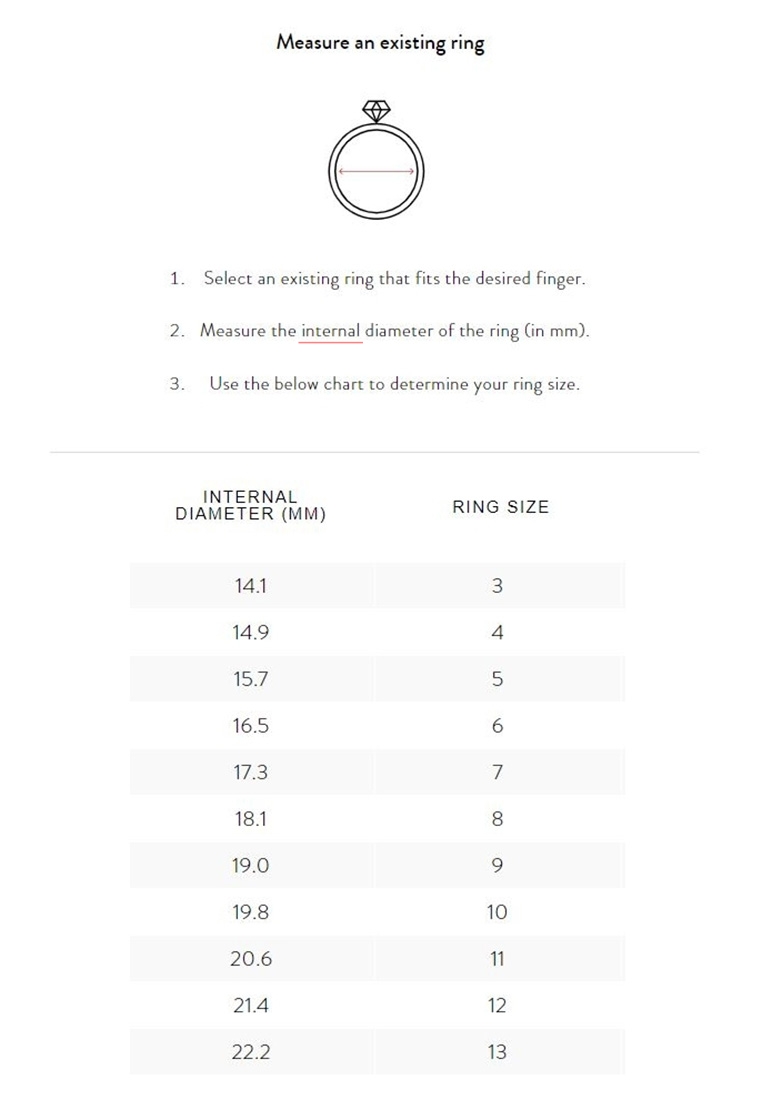 - Measure with an existing ring or your finger and use the ring sizing chart (last 2 photos) to determine your ring size.