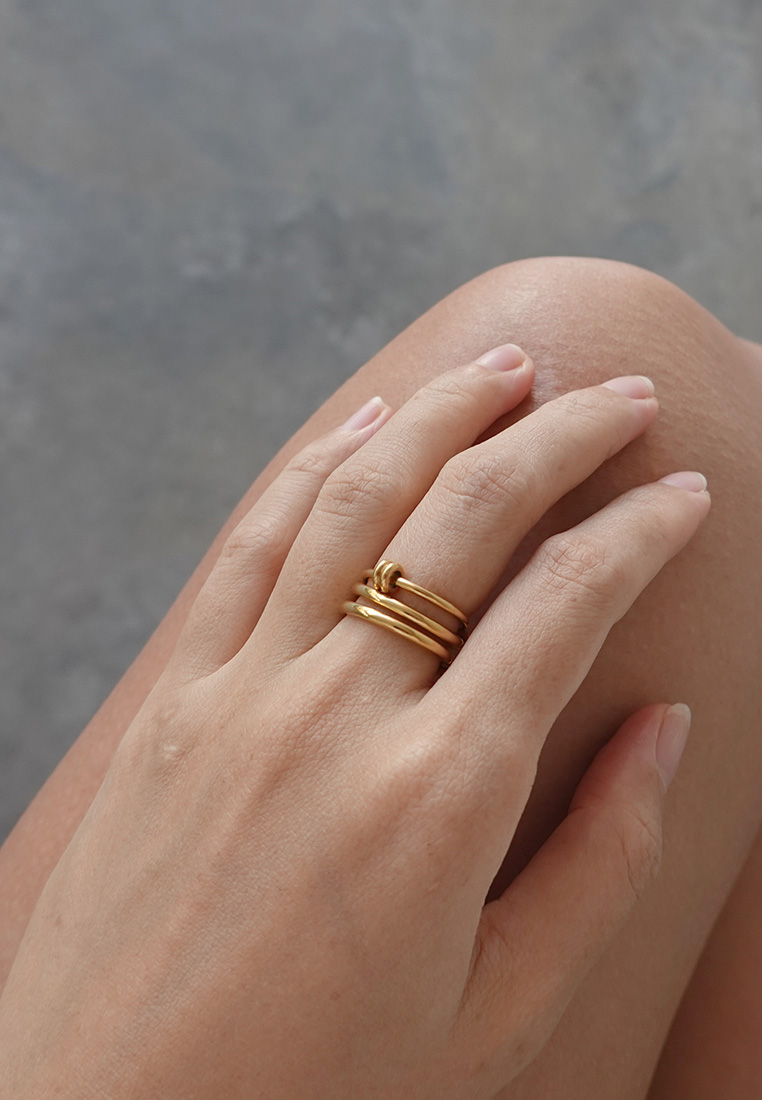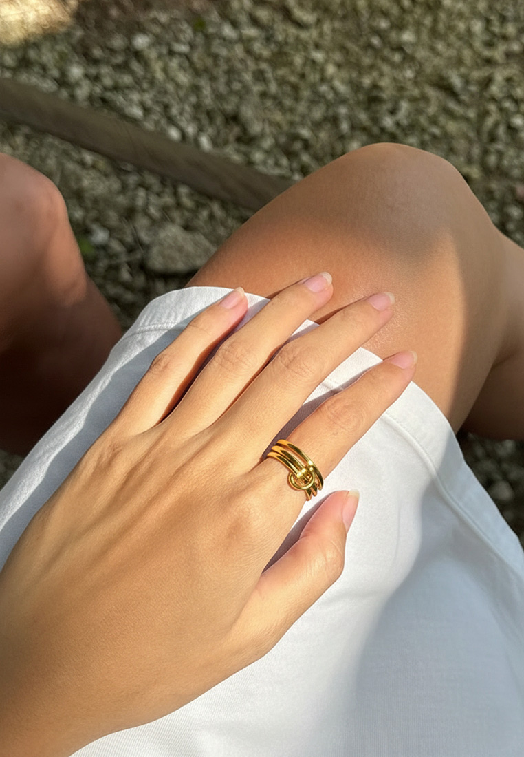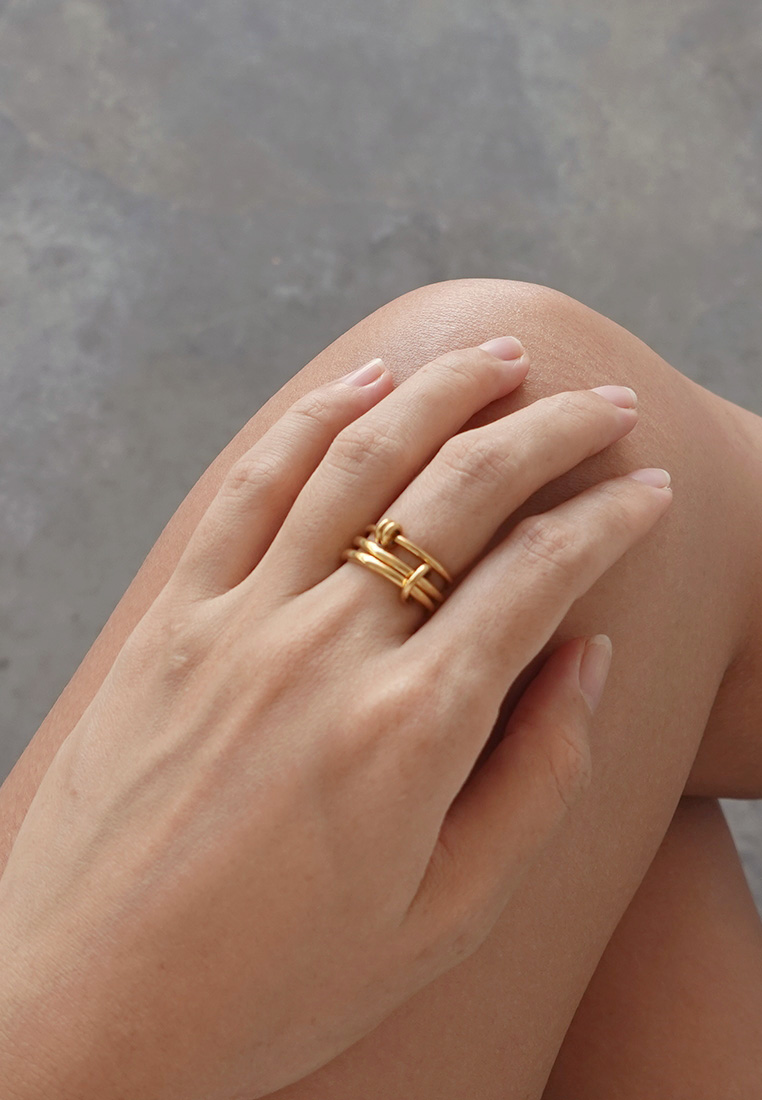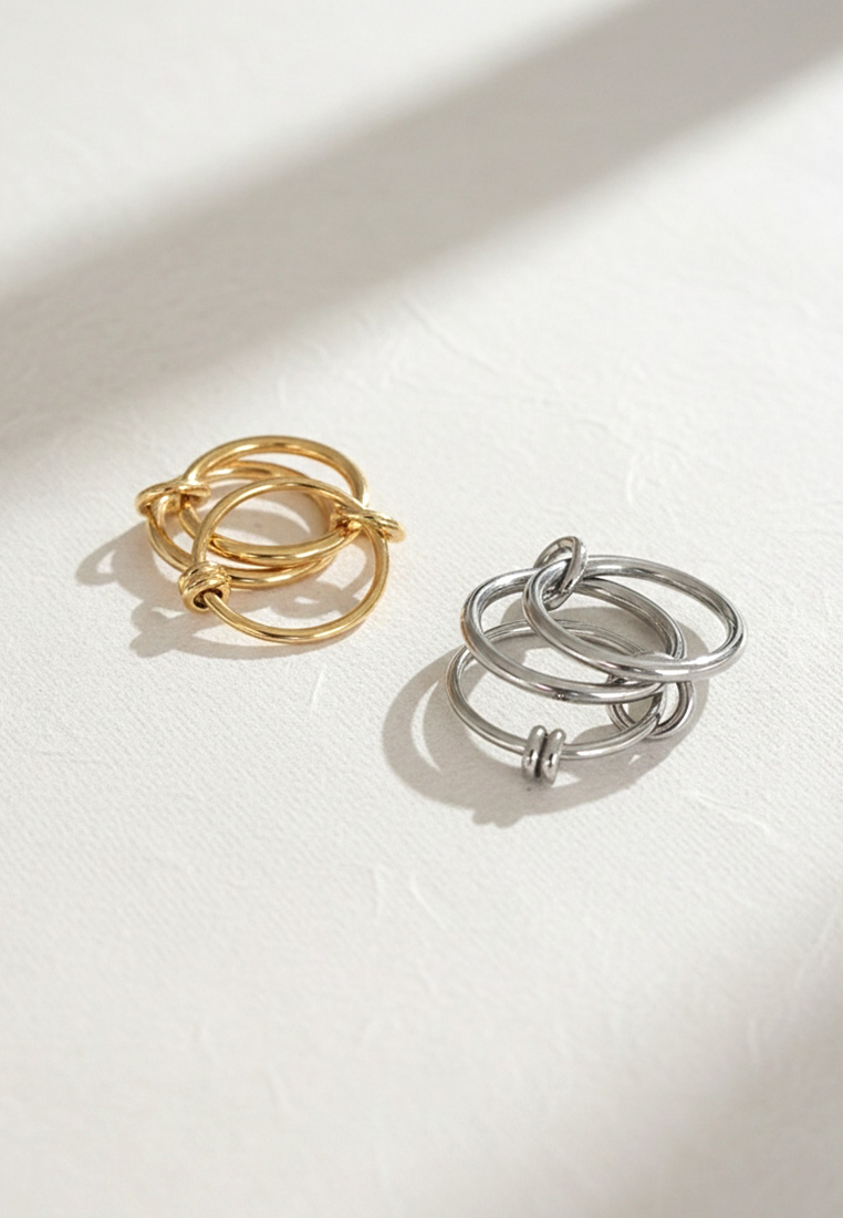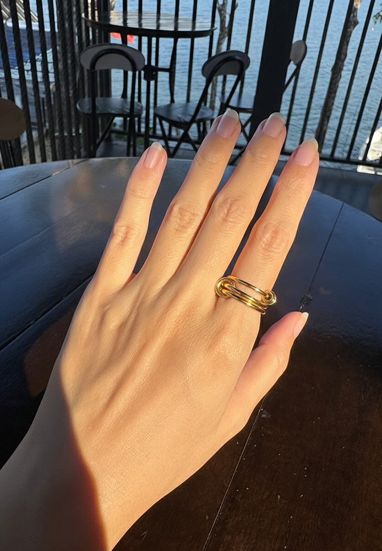 A contemporary ring featuring interlinked loops in contrasting gold or silver tones. Designed to symbolise connection and balance, the fluid circular forms create a bold yet effortless statement.