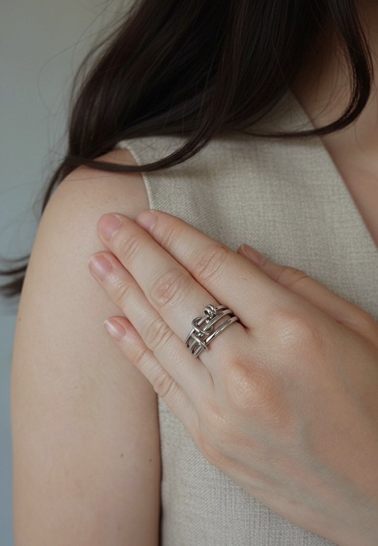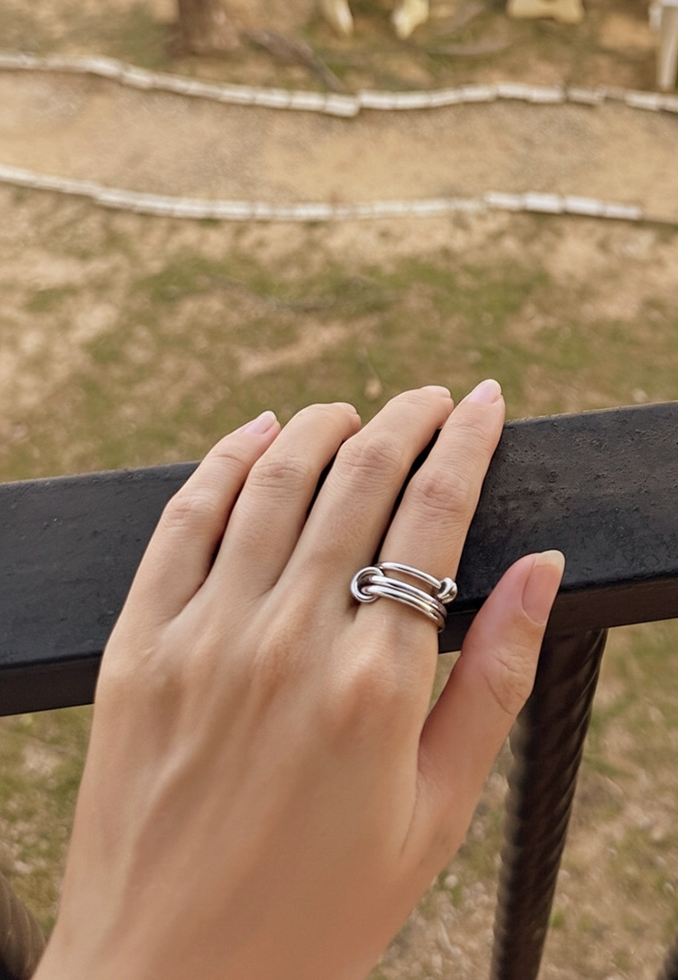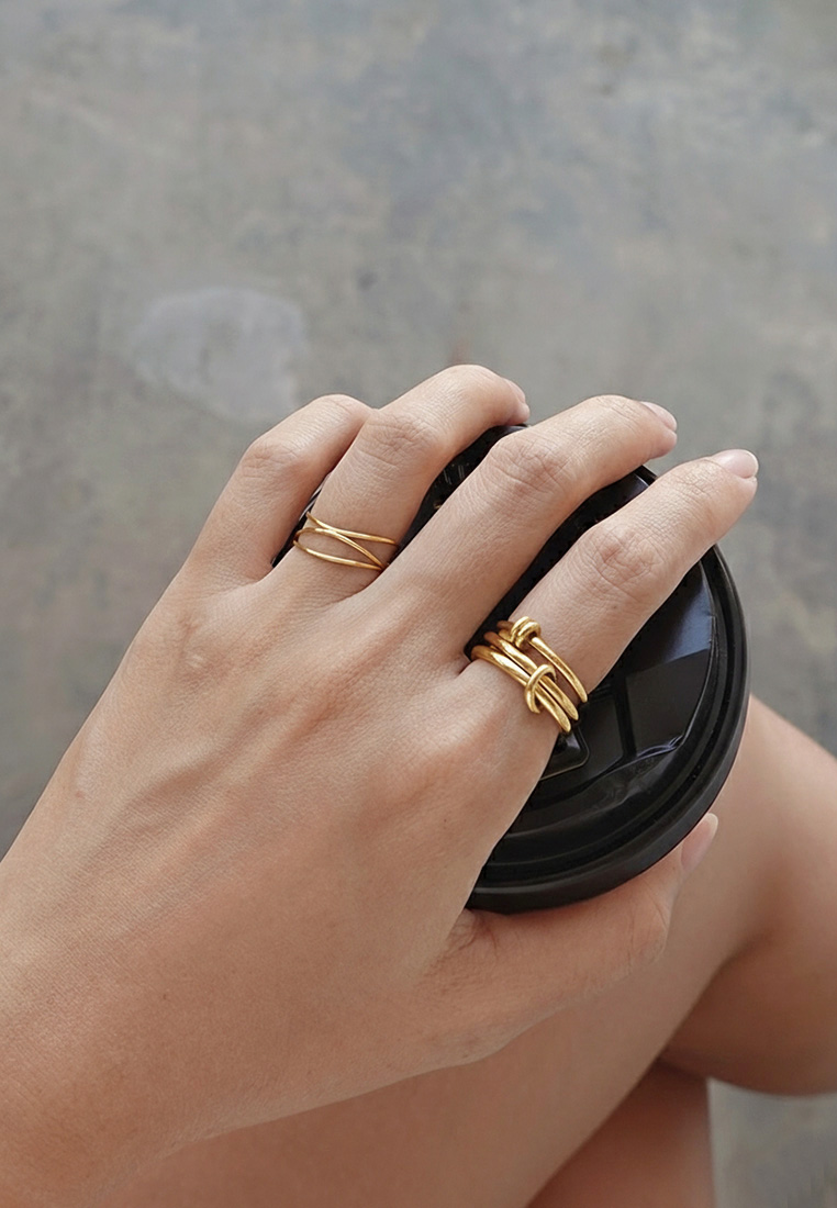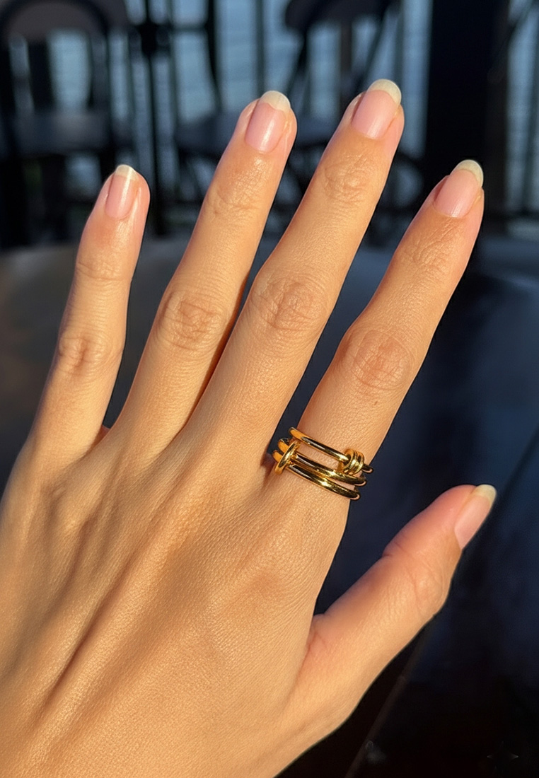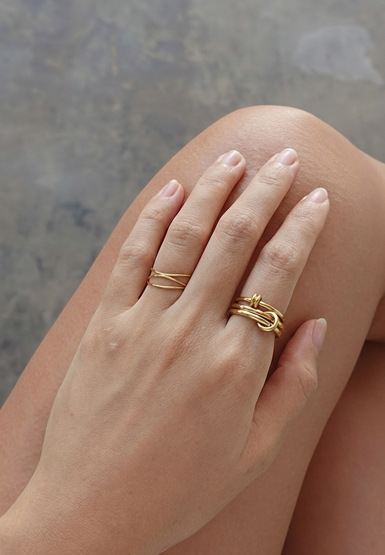 A contemporary ring featuring interlinked loops in contrasting gold or silver tones. Designed to symbolise connection and balance, the fluid circular forms create a bold yet effortless statement.