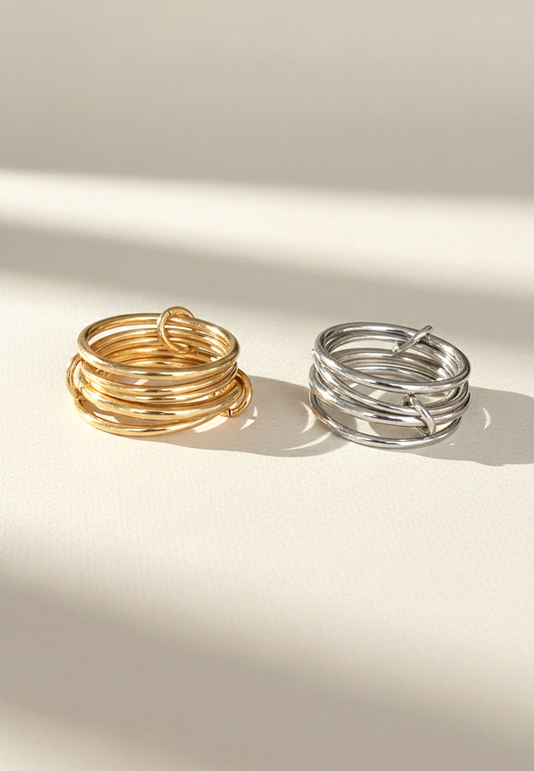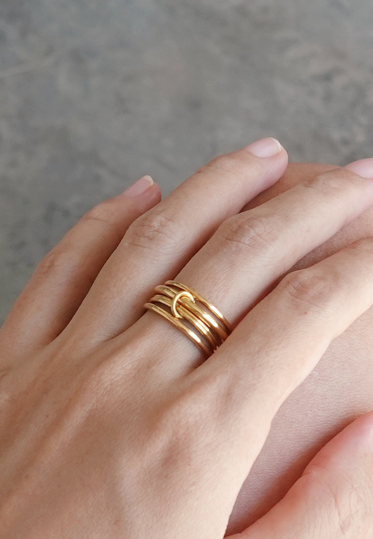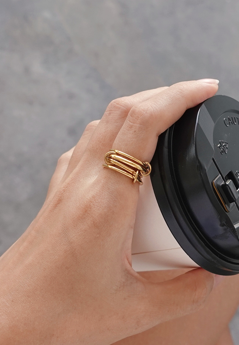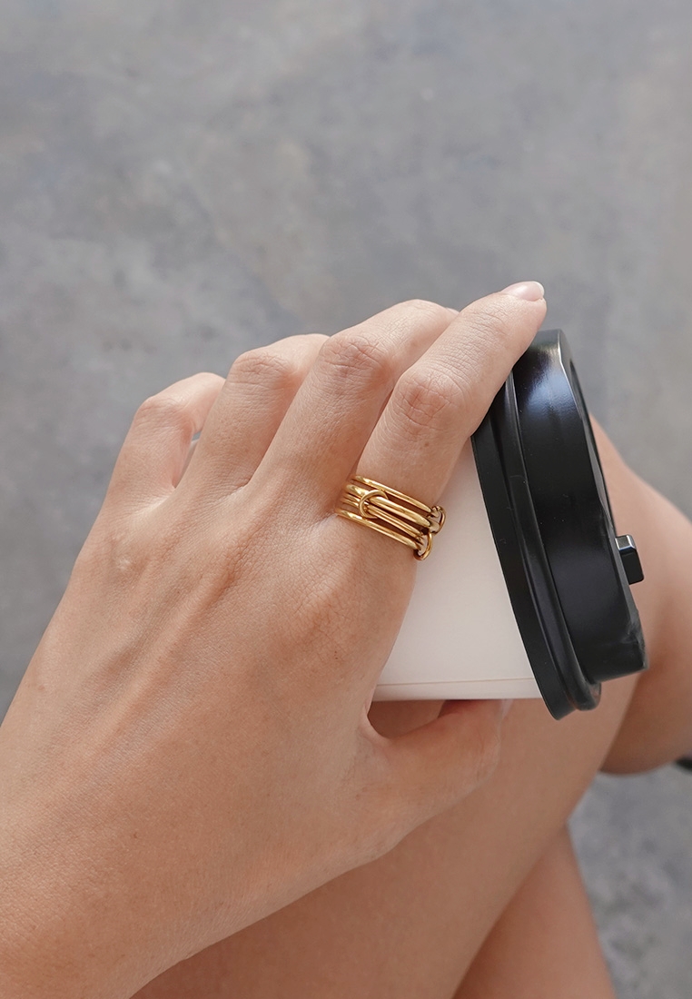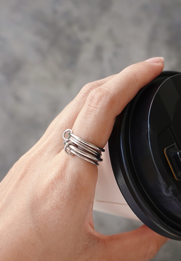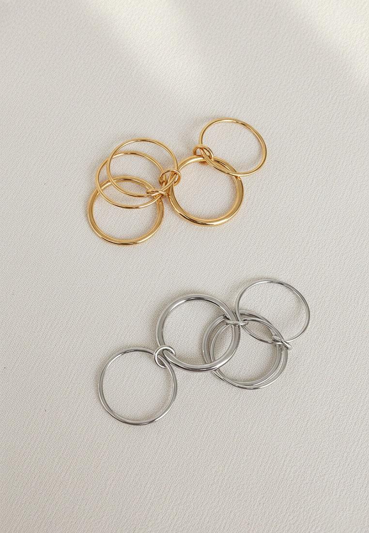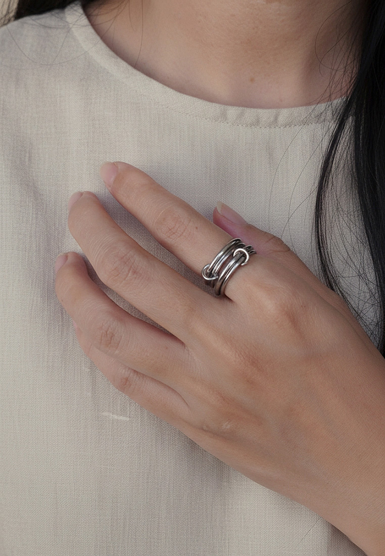 A modern ring composed of softly interlinked circles, designed to move naturally with you. The clean, rounded forms create an effortless statement—subtle enough for everyday wear, yet distinctive in its layered silhouette.