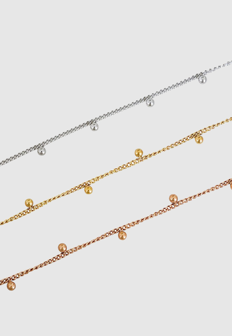 The bracelet features a fine chain adorned with evenly spaced polished beads, creating subtle texture and shine. Available in silver, gold, and rose gold finishes, this waterproof piece complements any look — perfect for layering or wearing solo for a refined minimalist statement.