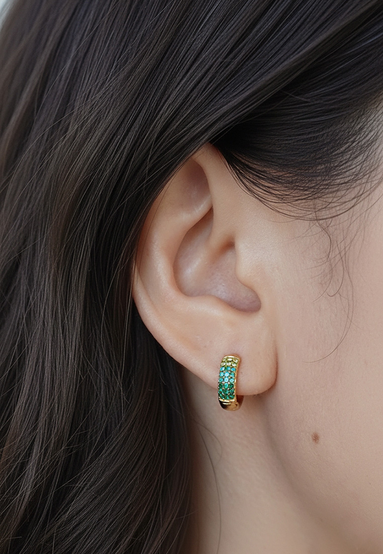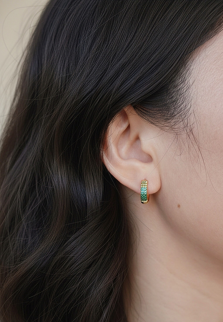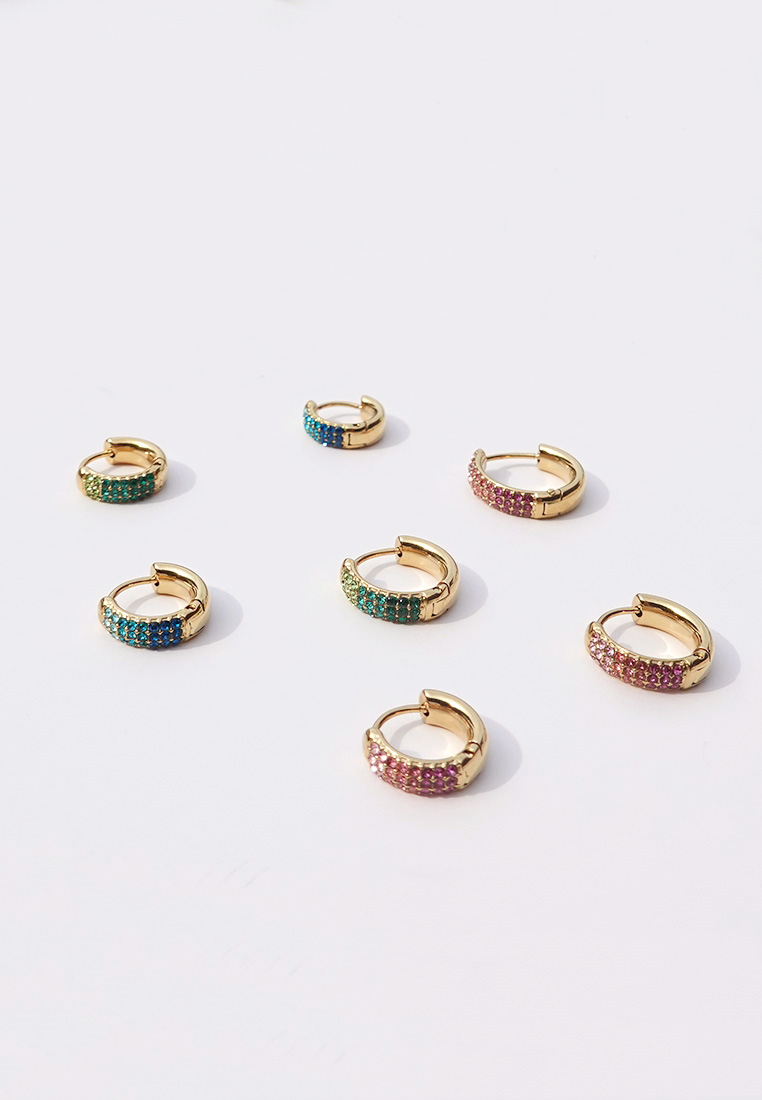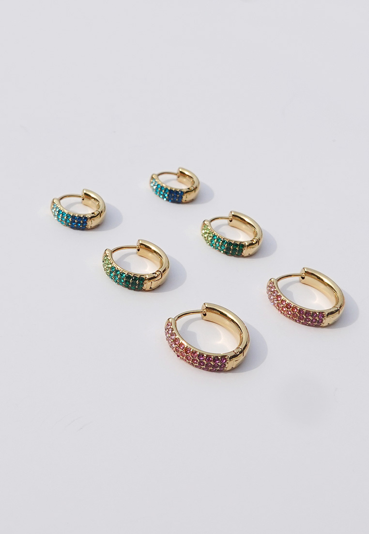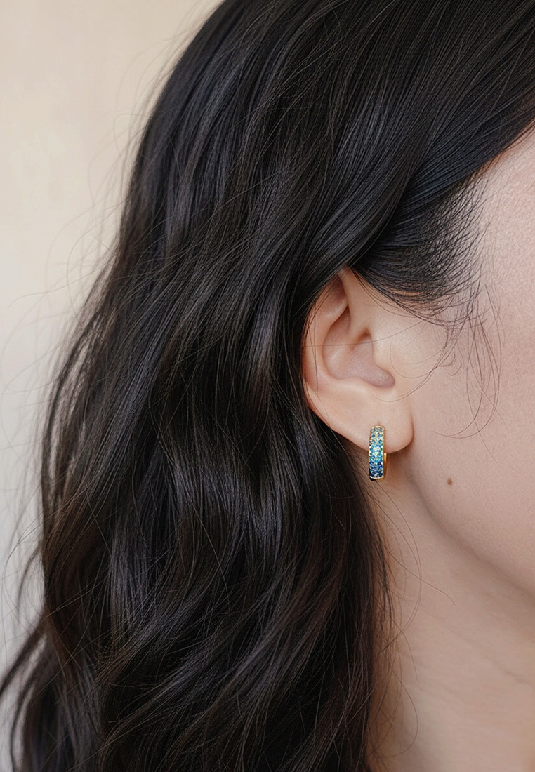 Add a splash of vibrant color to your ear stack with our Prism Pavé hoops. These gold-toned hoops feature three rows of shimmering, hand-set CZ stones in a beautiful ombré gradient. Designed with a secure click-clasp for effortless all-day wear, they are the perfect blend of bold playfulness and classic elegance.