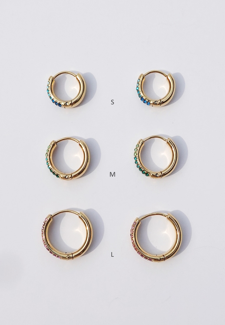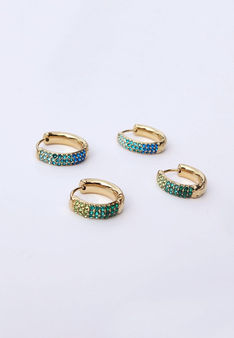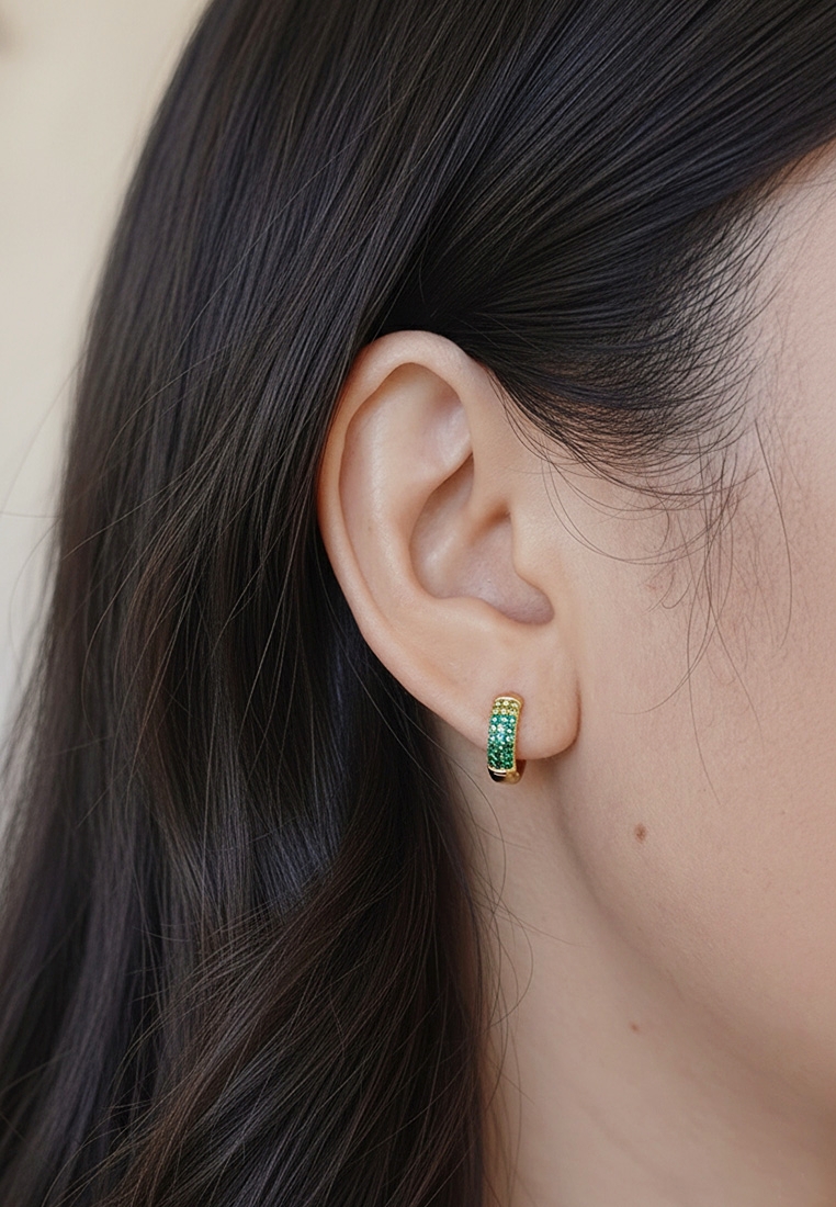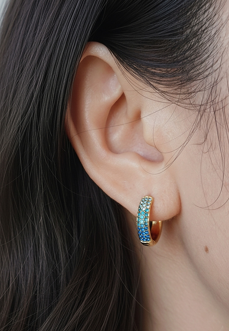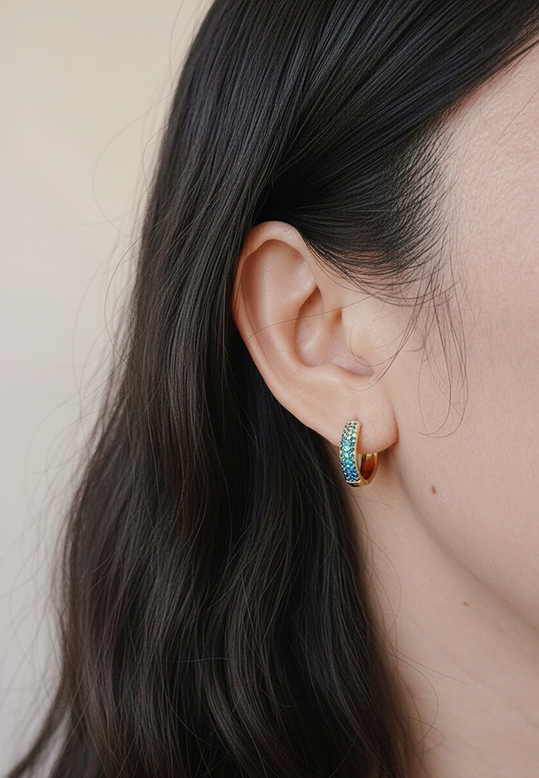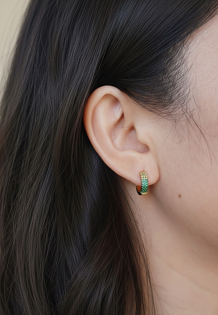 Add a splash of vibrant color to your ear stack with our Prism Pavé hoops. These gold-toned hoops feature three rows of shimmering, hand-set CZ stones in a beautiful ombré gradient. Designed with a secure click-clasp for effortless all-day wear, they are the perfect blend of bold playfulness and classic elegance.