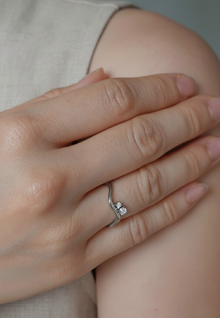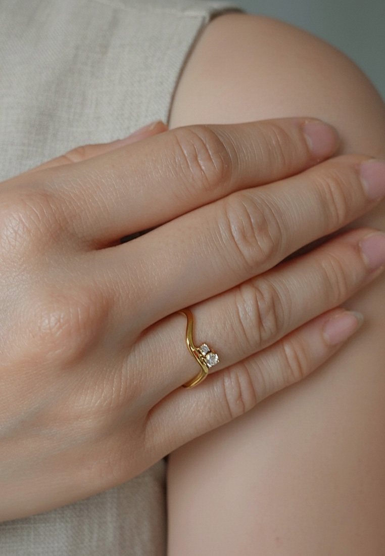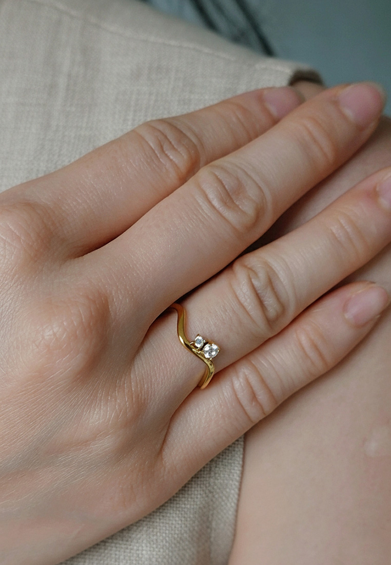 Sculpted with fluid curves and finished in radiant gold, the Wavelet Ring features two delicate stones nestled along its flowing band — a subtle play of contrast and elegance. This minimalist piece adds a soft yet striking silhouette to your everyday stack, perfect worn solo or layered.