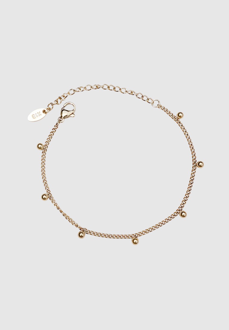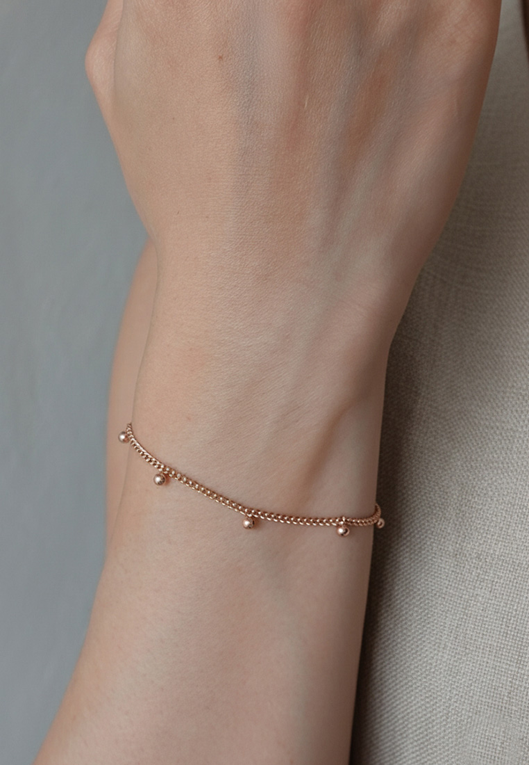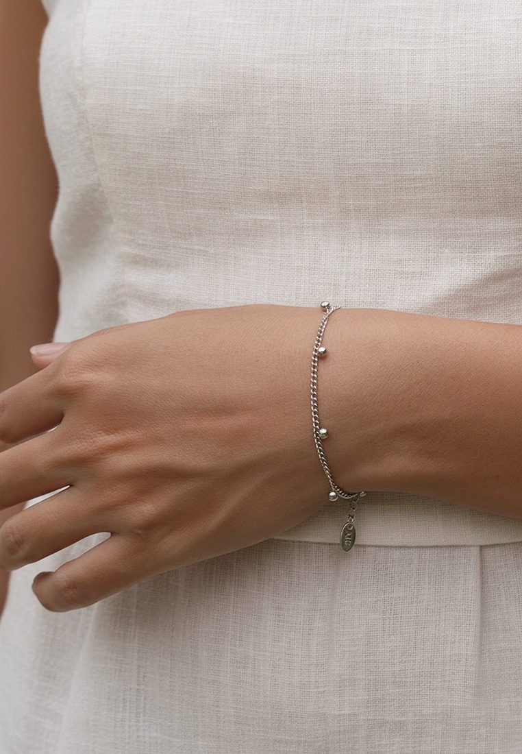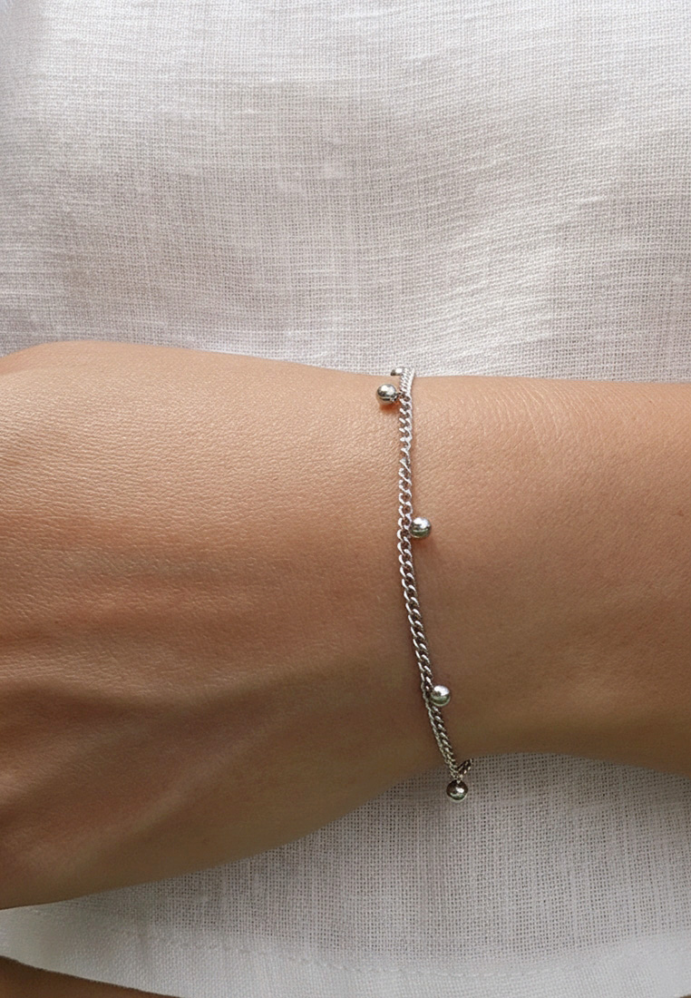The bracelet features a fine chain adorned with evenly spaced polished beads, creating subtle texture and shine. Available in silver, gold, and rose gold finishes, this waterproof piece complements any look — perfect for layering or wearing solo for a refined minimalist statement.